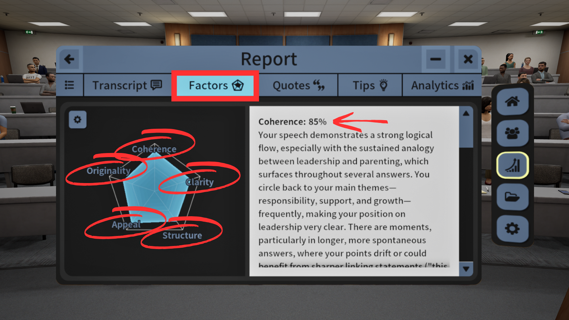 Ovation replaces guesswork with Factors: targeted criteria that its AI coach applies to your spoken words. Because Factors are editable, you or your organization can tailor them to the exact skills that matter, whether that’s persuasive structure for a sales pitch or bedside manner for a medical exam. The result is feedback that is specific, objective, and comparable from session to session, turning every practice into measurable progress.