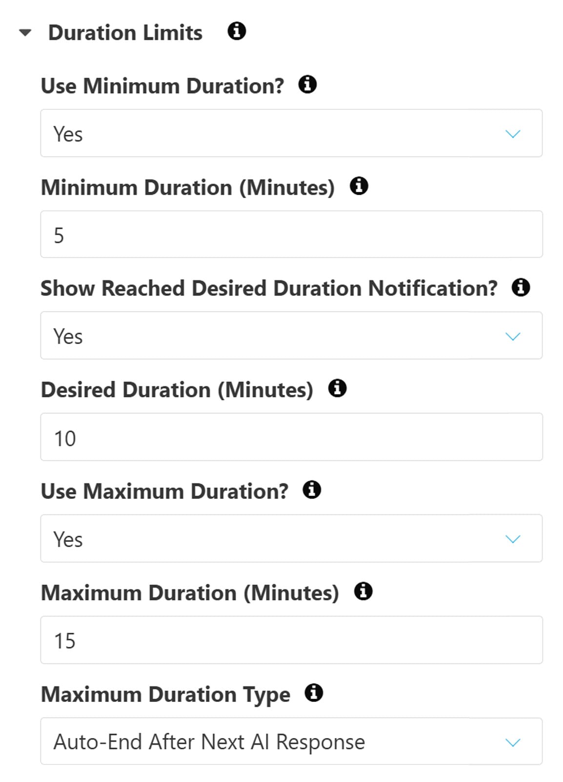 For maximum duration, you can choose whether the recording should stop immediately, after the next AI avatar response, or after the next user response.