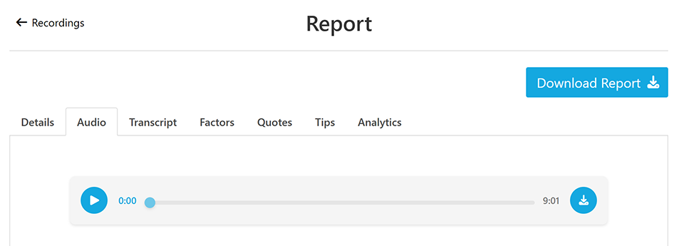 Recordings in Ovation now include audio playback and download directly in the web portal. Each report includes a new Audio tab where you can listen to the session and download the audio file for review, coaching, or sharing. This makes it easier to revisit key moments, evaluate delivery, and capture takeaways without replaying the recording in the Ovation software.