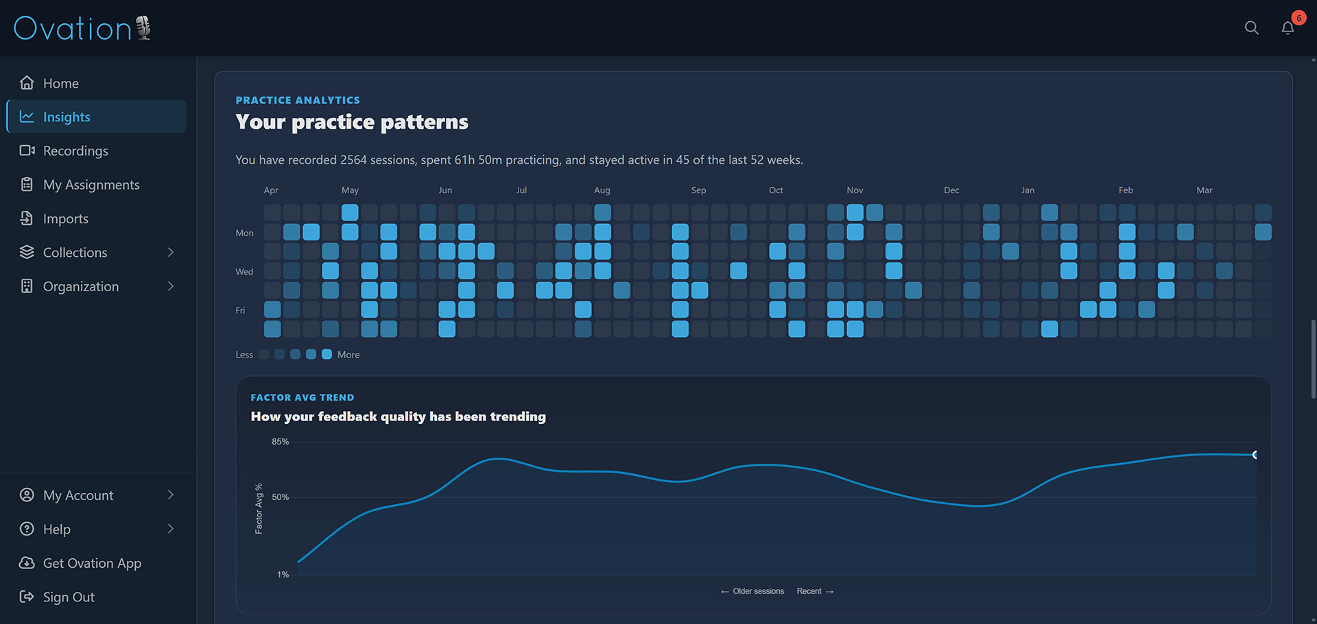 The redesigned Ovation web portal enhances visibility, actionability, and motivation, anchored by a new Insights page that brings together AI coaching, session comparisons, scenario recommendations, streaks, trends, leaderboards, and shareable progress snapshots in a single, streamlined experience (now available in dark mode).
