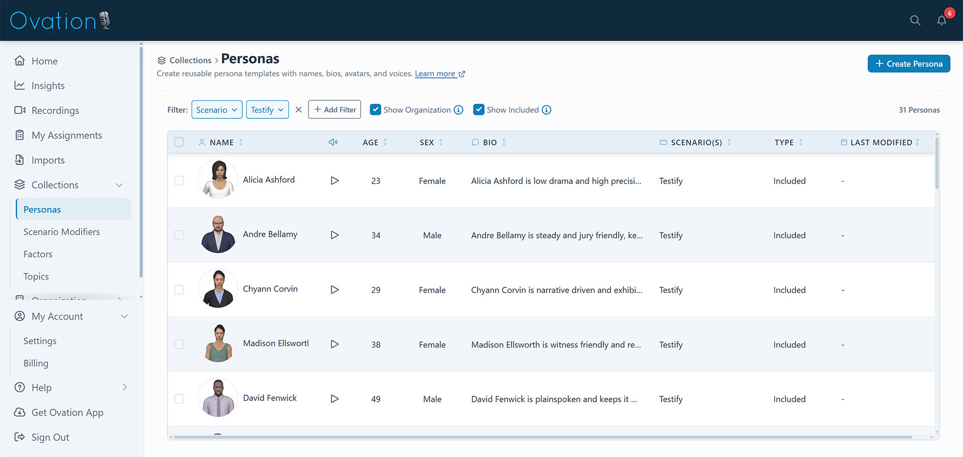 Personas define an avatar’s character, Scenario Modifiers tailor its behavior for a specific exercise, and Factors let you customize the feedback and evaluation criteria used in reports. Together, these three features give you powerful prompt-based control over how the AI performs and how Ovation evaluates each session.