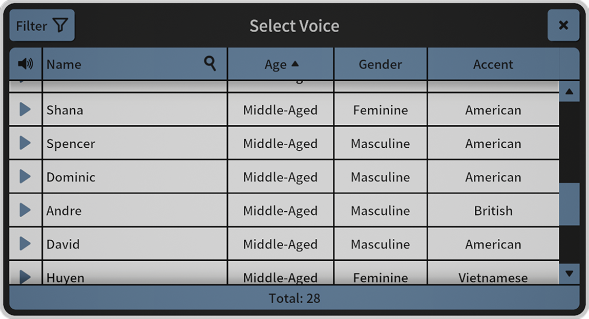You can request additional persona voices with different accents or speaking styles by contacting Ovation staff at feedback@ovationvr.com.